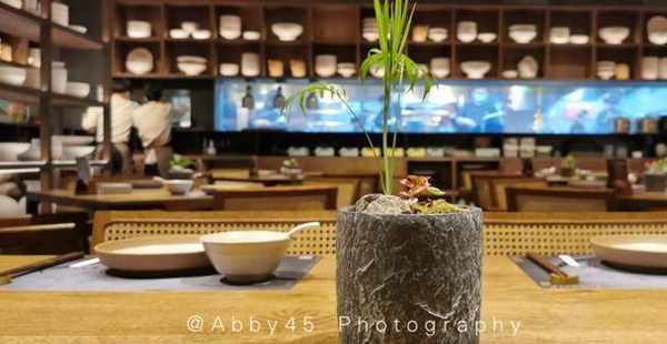 進入餐廳以後更是豁然開朗,打開新世界的感覺。用裝滿鍋碗瓢盆罐的陶瓷做裝飾墻,像極瞭藝術館。而透明的廚房可以直觀看到備菜全過程,他們傢廚師也真是多啊,難怪上菜極快。後來才知道餐廳是全球頂級設計大師關永權的作品,座椅更是印尼藤藝的頂級品牌瓦西裡,夠講究,我喜歡。