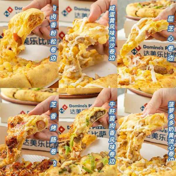 達美樂光是卷邊就有足足7種選擇!紅薯薯泥流心、肉肉香粉松、咸蛋黃風味流沙、菠蘿多多奶黃流心、雙層芝士、芝香烤腸、牛肝菌肉香風味,你完全可以根據自己的喜好自由搭配。