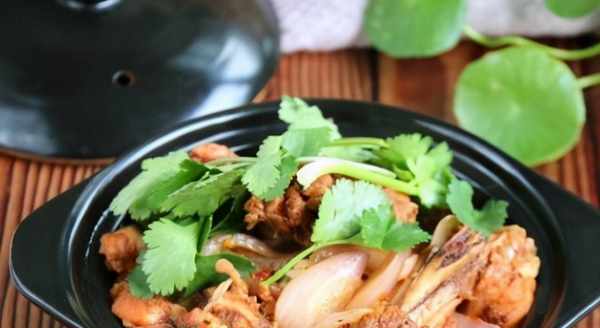 用料雞腿、洋蔥、油、老抽、雞公煲調料、香菜、蒜瓣