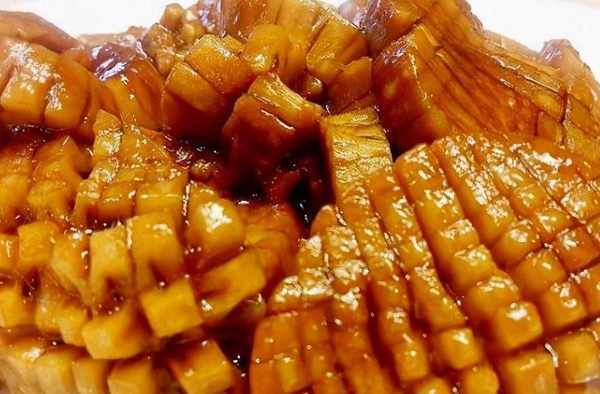 6、炸到起泡,焦黃為止,兩面也炸一下。撈出放冷水,這是為瞭泡軟一點好切片。