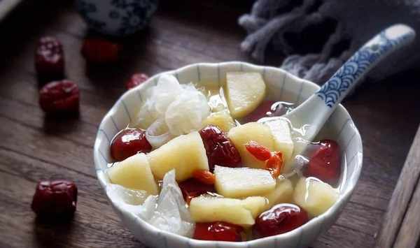 1.銀耳用適量的水泡發,泡發好後的銀耳去除蒂頭,清洗幹凈後撕成小塊;紅棗、枸杞洗凈。