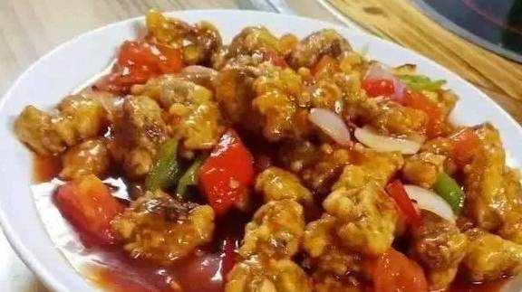 食材:排骨450克,彩椒適量,白醋30ml,白糖20克,番茄漿30ml,生薑3片,蒜頭2瓣,鹽1小勺,生抽15ml,生粉3大匙