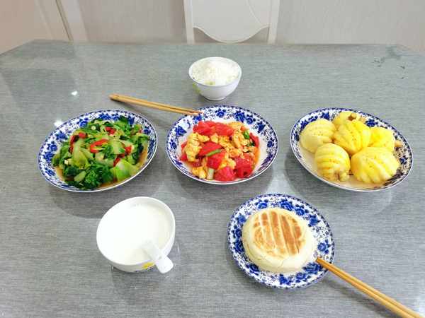 白吉饃,熱牛奶,炒小白菜,雞蛋炒西紅柿,米飯,再加一盤泰國菠蘿。