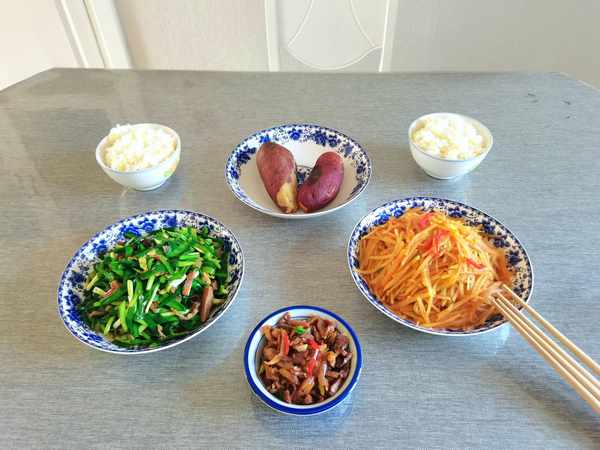 西紅柿土豆絲,烤紅薯,肉絲炒韭菜,炒肉絲,米飯。