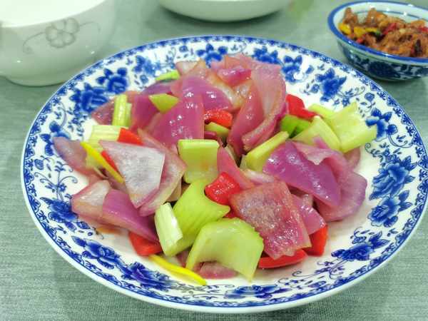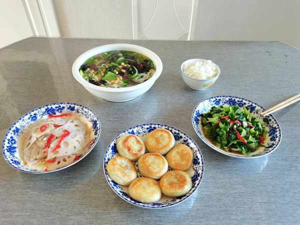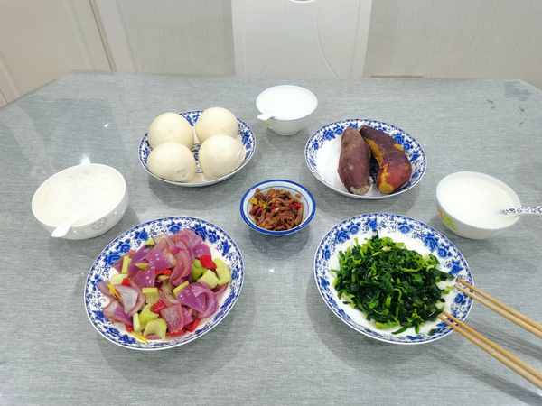 酸鮮芹菜葉子,鮮咸蔥頭芹菜,烤紅薯,炒肉絲,熱饅頭,大米粥。