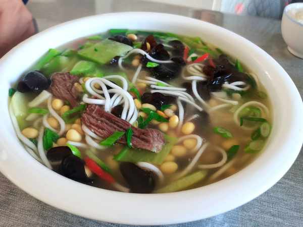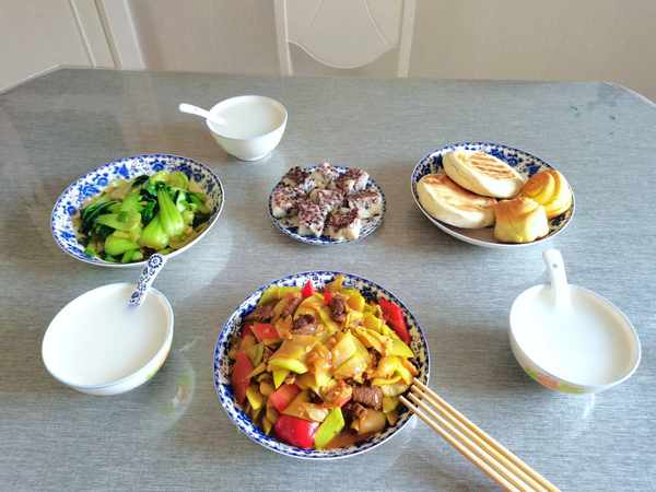 牛肉炒角瓜,大米稀飯,烤花卷,烙白吉饃,紅豆牛奶糯米糕,清炒油菜。