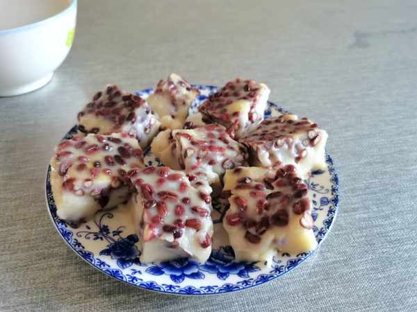 200毫升純牛奶,120克糯米粉,10克冰糖粉,攪拌成糊糊狀,然後倒入一小碗煮熟的紅豆,攪拌均勻。