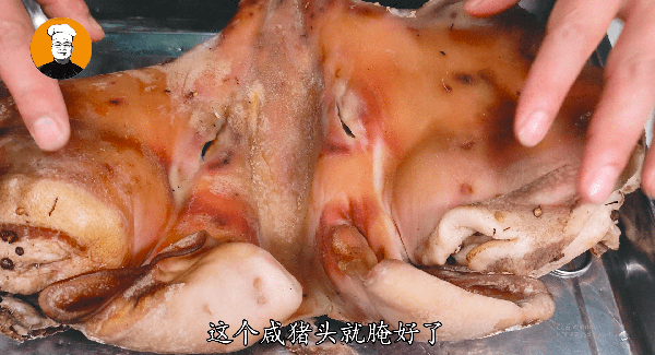 然後在上面放一些薑片來去除腥味。把它放在陰涼處醃制兩天。然後將醃好的豬頭放在太陽下曬幹醃制。切下一些豬頭肉,將豬鼻子、舌頭和耳朵放在溫水中浸泡十分鐘,以去除雜質