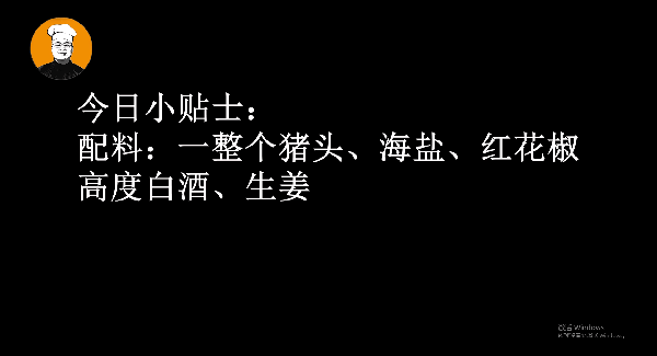 整隻豬頭、海鹽、紅辣椒、烈性白酒、生薑