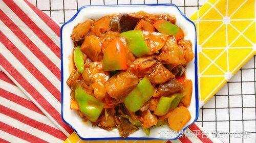 4、鍋留底油燒熱,放入蔥薑、幹辣椒、花椒炸出香味,放入胡蘿卜片、青紅辣椒翻炒均勻;再放入肉片、淋入調味汁迅速拌勻;色後放入黃瓜片拌勻即可出鍋。