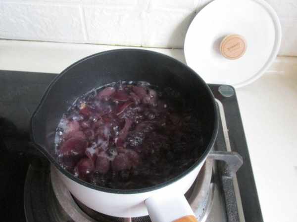 第三步:三禾小鍋中加入水和葡萄皮,大火燒開,改成小火慢慢的熬制2分鐘,水的顏色已經成為了紫色,把葡萄皮撈出去掉。