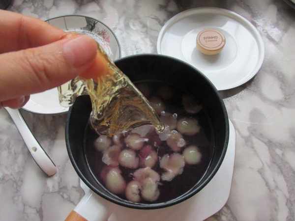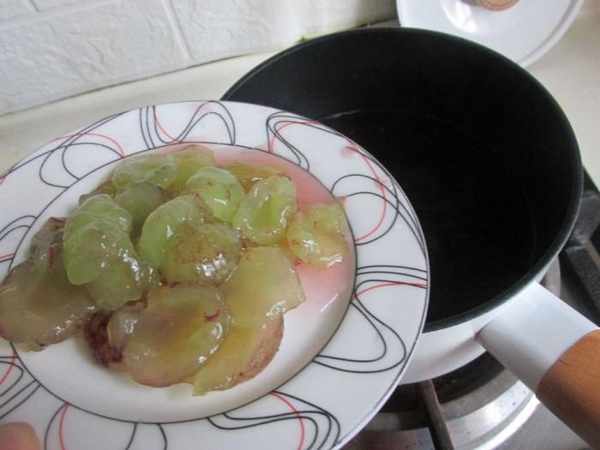 第四步:倒入葡萄肉,攪拌均勻,開鍋後就可以立即關火,加入適量的老冰糖融化。