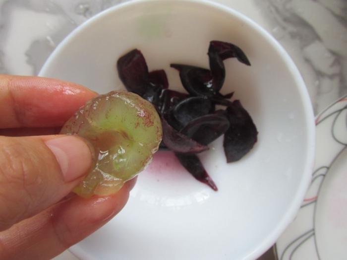 第二步:把葡萄洗淨之後,每一個葡萄都剝去葡萄皮,把葡萄中的籽去掉。葡萄皮營養也很豐富,不要扔哦。