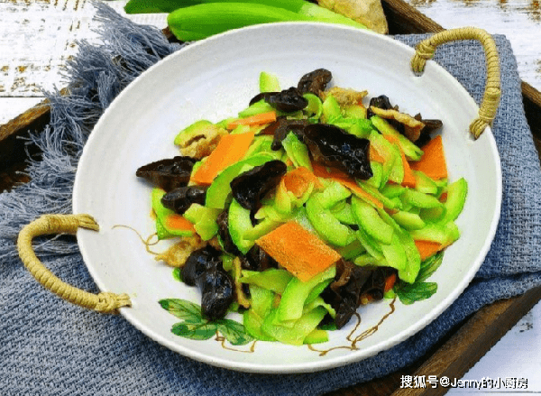 鍋內加油,燒熱後放入蒜末爆香,再倒入胡蘿卜、木耳翻炒,炒到胡蘿卜變軟。