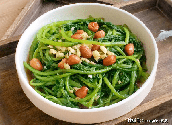 茼蒿瀝幹水分,加入蒜末、生抽、香醋、香油攪拌均勻,再放入花生米,這道菜就做好瞭,清爽可口,太解膩瞭。