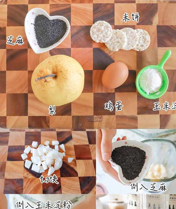 梨40克、雞蛋1個、玉米淀粉10克、黑芝麻5克、米餅適量