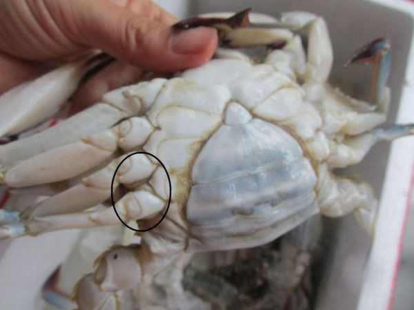 然後我們再來認母蟹,拿起螃蟹,翻個就可以看到母蟹的臍是圓形的。然後挑選的時候認准了公母,再用手捏下它的爪,上圖圈起的地方,如果捏起來爪很實不空,那麼這個螃蟹的肉就是比較肥美的。