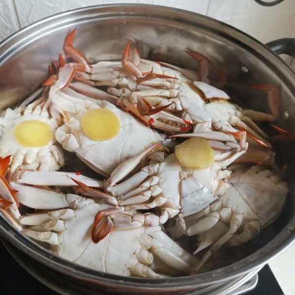 挑選好了以後,清洗乾淨去掉橡皮筋,肚臍朝上放到籠屜上,放上幾片薑片去腥,水燒開後,把籠屜放上,大火蒸10分鐘就可以了。時間不需要太久,太久了就會蒸的膏和黃流出。
