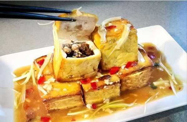 相傳清乾隆帝南巡時,曾經過博山,地方官員招待用膳時,上有豆腐箱這道菜,乾隆食後贊不絕口。2018年9月10日,“中國菜”正式發佈,“博山豆腐箱“被評為山東十大經典名菜。博山豆腐箱做法復雜,要求嚴格,豆腐需要用博山酸漿點的豆腐,廚師將豆腐切成均勻長方塊,共十二塊,放在六至七成熱的油鍋內炸成金黃色,炸好以後,將豆腐內核掏空,豆腐的中空內核塞滿用筍尖、木耳、豬肉丁、醬油做好的肉餡。好的餡鑲在豆腐塊之間,上籠蒸一刻鐘取出,然後澆上用番茄塊、黃瓜丁、香菇、木耳勾芡制成的高湯澆頭。