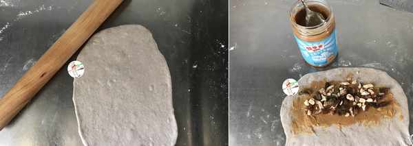 6、取一個大面團,按扁,用搟面杖上下搟開,搟成長方形面片,將周邊氣泡按壓掉,松弛好的面團搟起來很輕松的,不回縮;翻面,然後在面片中間,均勻地抹上薄薄的一層花生醬,再放上巴旦木和葡萄幹,用手指壓薄底邊,方便收口;如圖所示。