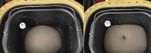 4、把面團重新收圓,放回面包桶並合上蓋子;由於黑全麥粉和少糖,均會影響面團發酵效果,所以,我用面包機自帶的發酵功能來輔助發酵;發酵至1.5~2倍大時,用手戳洞不回縮,說明發酵OK。時間長短,需要看面團的發酵狀態;熱天,室溫發酵就可以瞭。