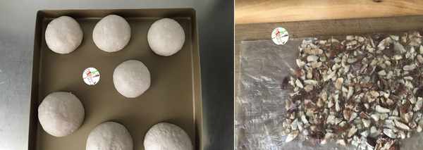 5、把面團拿出來,放案板上按壓排氣,先按150克/份,分割成3份;再把剩餘面團平均分成4份,分別搓成圓球,蓋上保鮮膜,再松弛15分鐘;大傢也可以根據自己的喜歡來分割。利用這時間,把備好的巴旦裝入保鮮袋,用搟面杖敲小粒備用,大小和葡萄幹差不多;也可以換成自己喜歡的其它果幹;其實,什麼不放也好吃,不要問我是怎麼知道的,小夥們懂的啊!