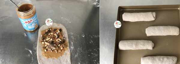 9、接下來把餘下的4份小面團,也用同樣的方法,搟開、抹花生醬、放巴旦木和葡萄幹,然後再卷成卷;放在金色的不粘烤盤中,送至溫暖處發酵;我是放微波爐中室溫發酵的,速度慢些,剛好可以和第一盤面包,錯開烘烤時間。