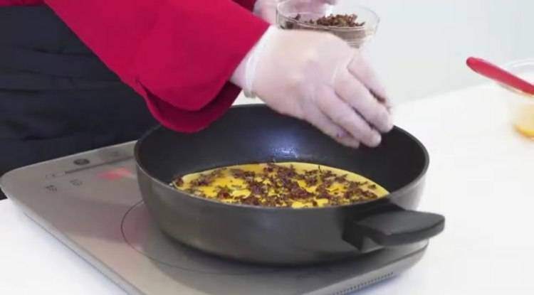 在熱鍋中加入冷油,燒熱後改小火,下十分之九雞蛋液攤成餅。