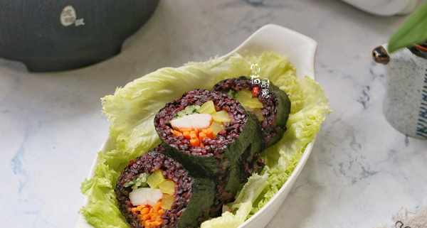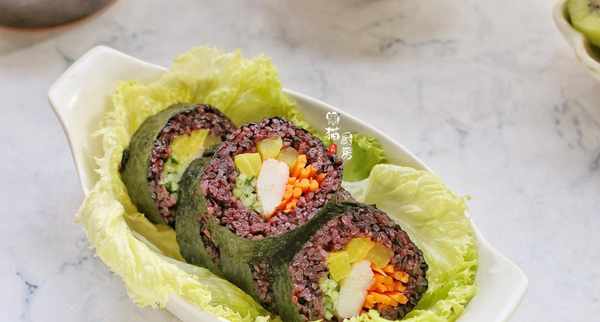 食材:糯米50克,紫米100克,白米醋1茶匙,鹽少許,胡蘿卜、青瓜絲、蟹棒適量。