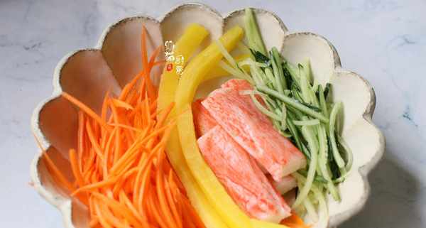 5.準備一些做飯團的食材,胡蘿卜絲、醬蘿卜、蟹棒、黃瓜絲等,孩子愛吃的都可以準備上。