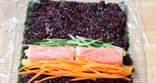 6.準備一張制作飯團的紫菜海苔,蒸熟的糯米紫米均勻地平鋪在紫菜上,再把準備好的食材依次鋪在紫米飯上,然後利用壽司簾,把飯團卷緊實即可。