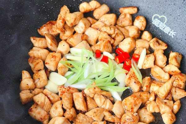 5、炒鍋中火燒至掌心有灼熱感,倒入適量花生油後大火加熱,下入醃制入味兒的雞丁大火煸炒,等雞丁炒到表面金黃的程度就可以將切好的蔥花蒜片和辣椒圈下鍋瞭。
