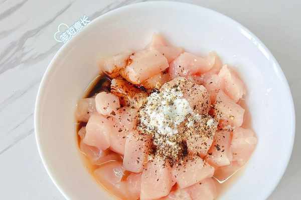 2、超市買的雞胸肉質肥厚,表層還會有一層白色的筋膜和肥油,食用之前先將雞胸肉用水洗凈,再將肥油和筋膜剔除幹凈,再切成大小均勻的雞丁裝入碗中,放入1勺料酒、1勺生抽、2克食鹽、1勺淀粉和少許黑胡椒粉後用手抓勻,讓調料將雞丁充分裹勻後醃制10分鐘左右。