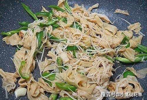 3、熱鍋倒入適量的油,放入大蒜炒香,然後將豆腐皮和金針菇倒入鍋中,中火炒熟。
