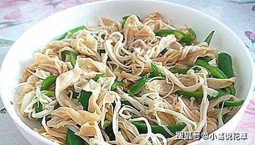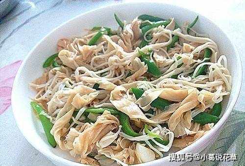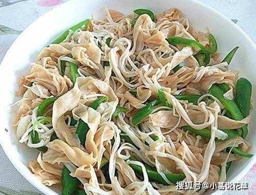1、豆腐皮用冷水浸泡,洗凈。2元金針菇切下根部,撕開洗凈。3條微辣的青辣椒。