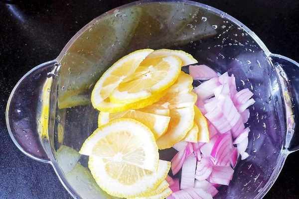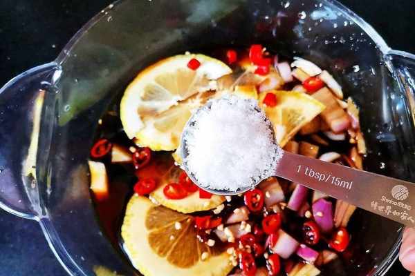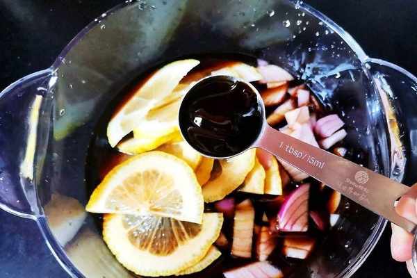 5、檸檬切片,洋蔥切碎,然後加入5勺的生抽和8勺的陳醋,然後加入一大勺的蠔油和一大勺的白糖。