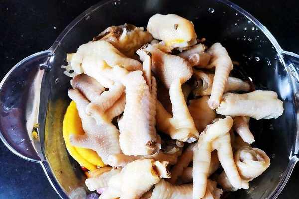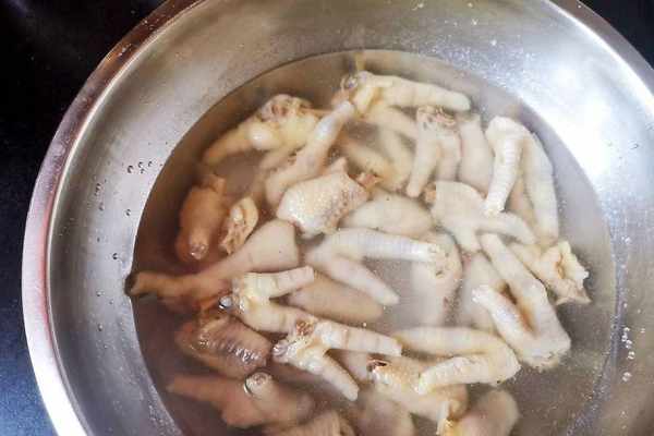 4、煮好之後撈出過涼水,為瞭讓雞爪的肉質更加筋道,一定要冷水,或者是在水中加入乙烯二冰塊這樣更好,然後撈出來。