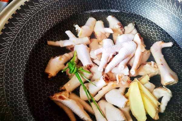 3、加入薑絲和蔥節,大火煮開後轉小火燉煮10分鐘,可以根據個人口味喜好,煮到自己喜歡的軟爛程度。這裡教大傢要是喜歡很軟爛的話,可以直接將雞爪放入壓力鍋中,壓一下。