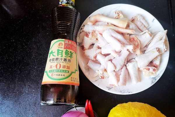 【烹飪食材】:雞爪500克、生薑片適量、檸檬一個、蔥一根、香菜適量、陳醋8勺、生抽5勺、小米椒4個、洋蔥半個、鹽適量、白糖1大勺、蠔油1大勺