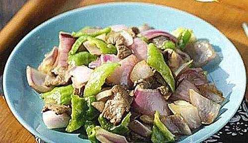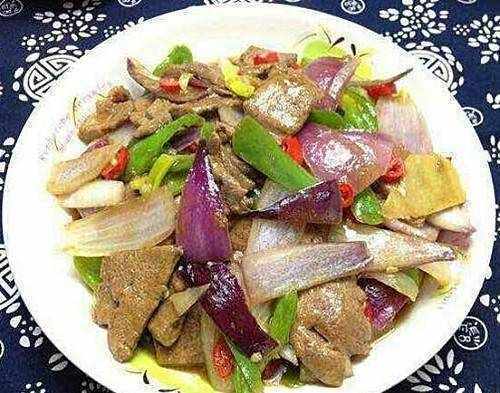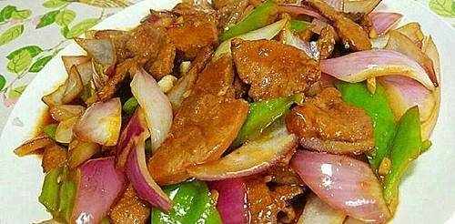 3、熱鍋倒入適量油,放入蒜頭和薑絲炒香,加入豬肝快炒至熟,再加入青辣椒和洋蔥一起快速翻炒。