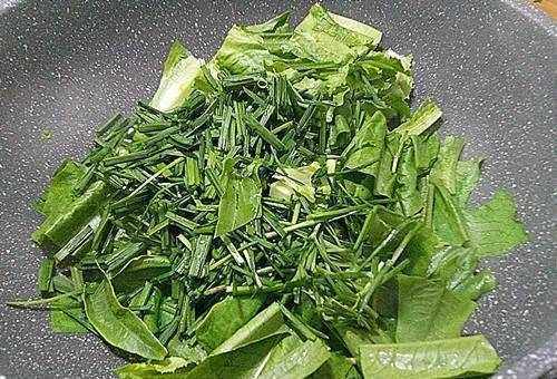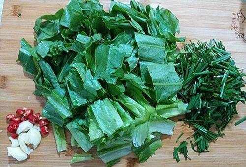 2.熱鍋倒入適量油,將大蒜和小米切碎,炒香後加入生菜和洋蔥末。