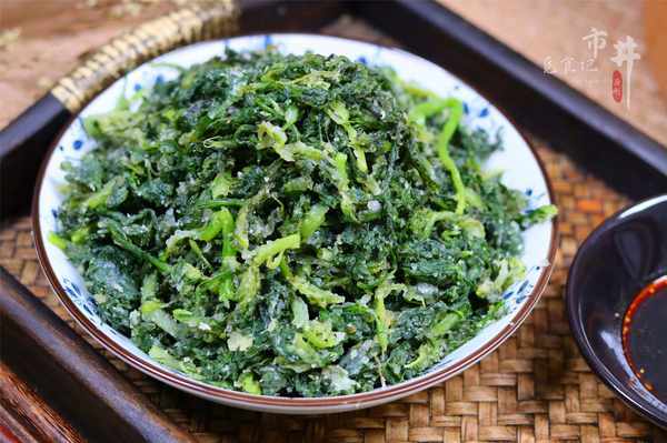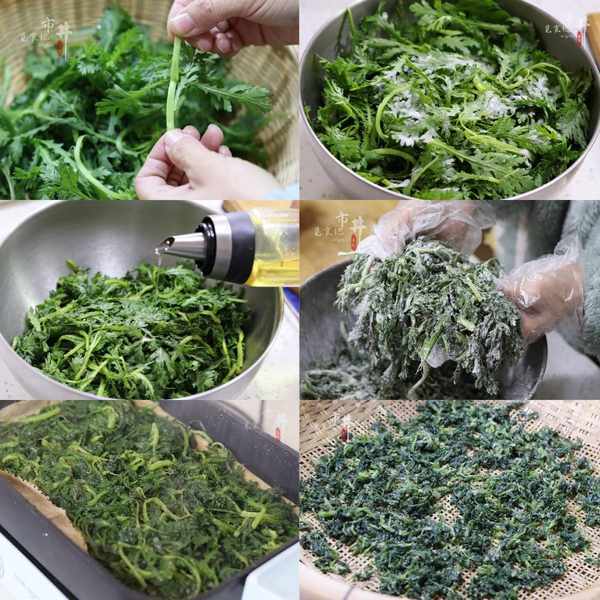 6、茼蒿蒸好後取出,趁熱抓散,晾至微涼蘸上蒜汁食用。