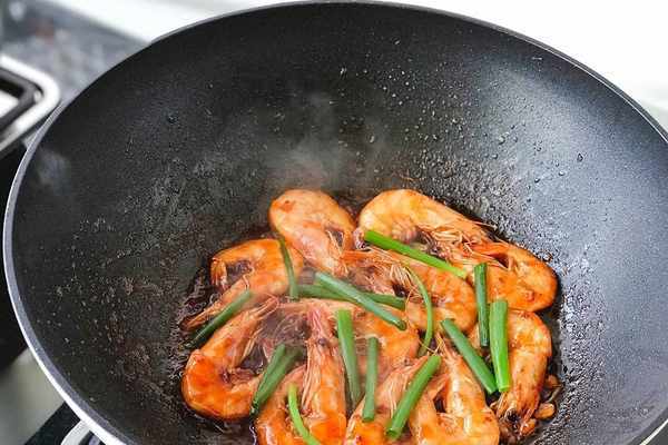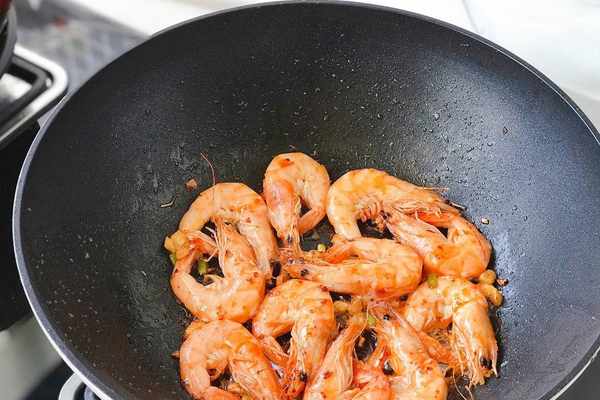 4、中火將海蝦煸炒到顏色變紅、外焦裡嫩的程度,滿屋子都能聞到蝦油特有的誘人香氣,還沒做好孩子就聞著香味兒到廚房催我瞭,還好這道菜簡單不費時,幾分鐘就能上桌。