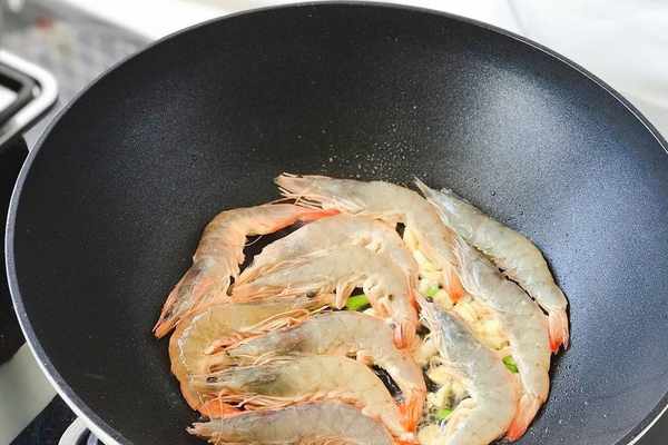 3、炒鍋中火熱鍋至掌心有灼熱感,倒入少許食用油後燒至7成熱,先將蔥花和蒜末下鍋煸炒出香味兒,再下入清理幹凈的海蝦翻炒。