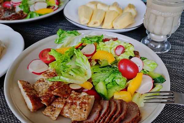⑥,最後把雞肉切條,醬牛肉切片,拌好的蔬菜沙拉都裝盤,低脂高蛋白的營養早餐就做好瞭