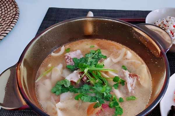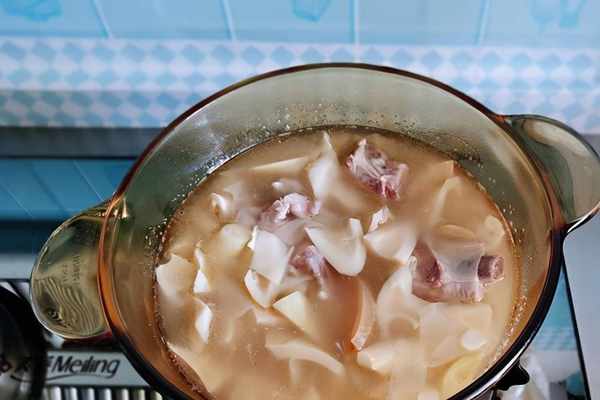 排骨自然解凍後涼水下鍋,加1勺料酒,再放入3片火腿肉片一起焯燙變色,逼出排骨裡的血沫,變色的排骨和火腿肉片撈出放入開水鍋裡,加兩片生薑,1勺料酒,大火燒沸騰後調成小火燉半小時,再加入竹筍塊,繼續燉10分鐘,加一點點鹽調味即可。