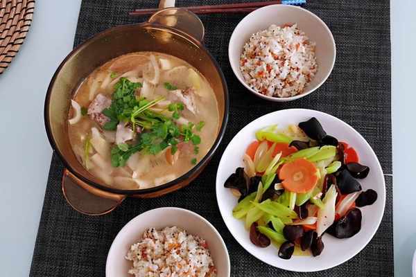 忙瞭一段時間還真覺得挺累的,這一歇下來人就不想動瞭,看看冰箱裡零零碎碎的食材湊合一下也能對付過午餐。主食是藜麥飯,藜麥淘洗後浸泡半小時,再加入大米,胡蘿卜丁一起煮飯。