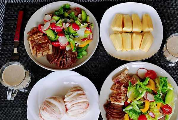 先生提早回來,沒來得及買菜,好在傢裡還有點新鮮蔬菜,早餐還算做得不錯。醬牛肉,煎雞胸肉,蔬菜沙拉,熱飲核桃紅棗百合蓮子漿