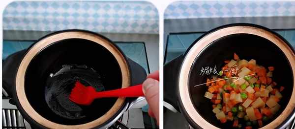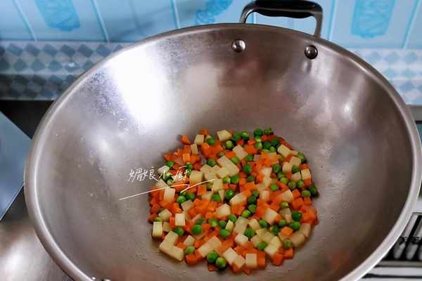 2、熱鍋加少許油,加入胡蘿卜土豆丁和豌豆仁,中火煸炒至土豆丁變半透明色