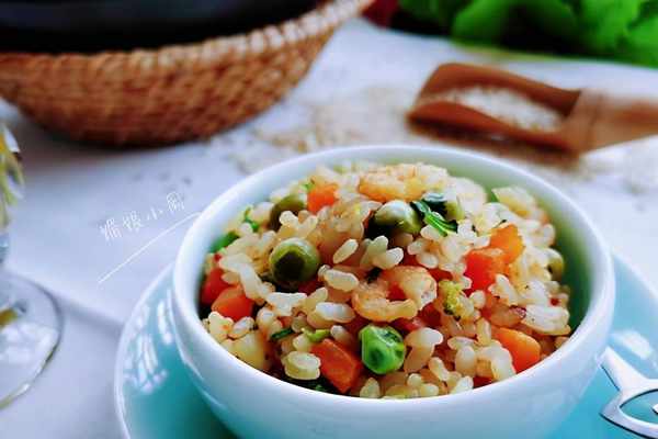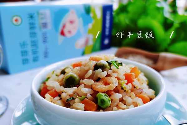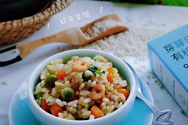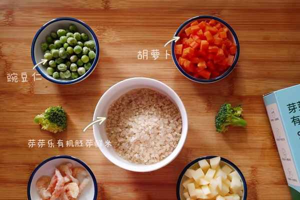 1、蝦幹提前用清水浸泡15分鐘,加入1勺料酒給蝦幹去腥,土豆去皮洗凈切1厘米的小丁,胡蘿卜洗凈切同樣的小丁,豌豆仁清洗瀝幹水,胚芽米清水輕微地淘洗一遍即可